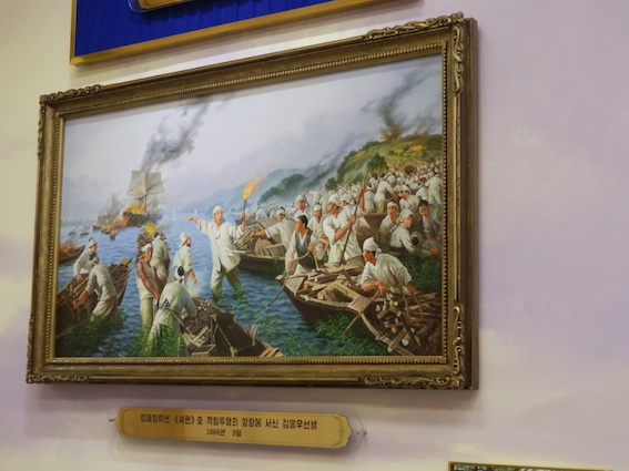 万景台革命事績館のガイドの説明によると、金膺禹(キム・ウンウ)は1886年に北朝鮮に侵入したアメリカの武装商船を焼き討ちにした事件を指導していたとのことです。