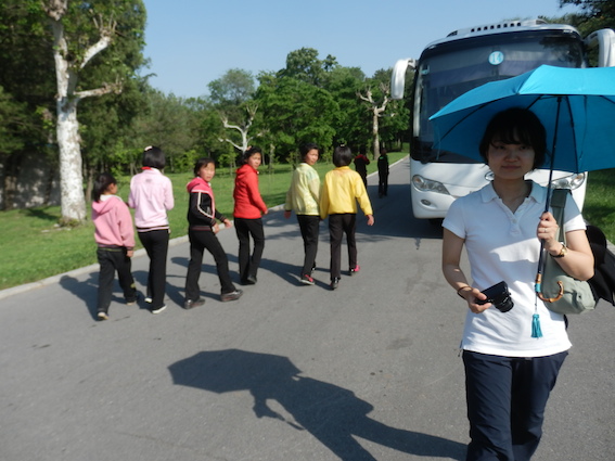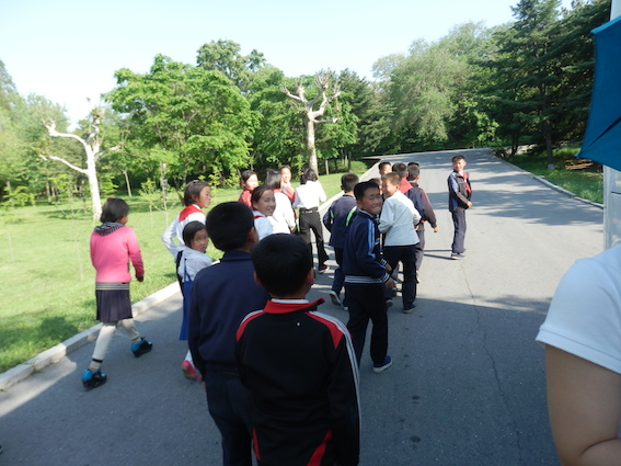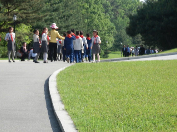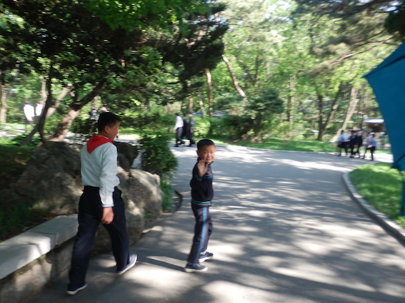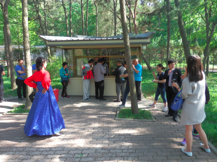 それを呆れた感じでチマチョゴリを着た北朝鮮人の現地ガイドが眺めています。