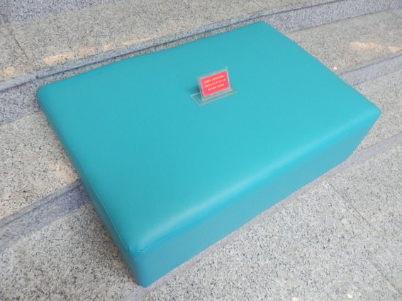 中に入ると、緑色のいすが並んだ広場があります。