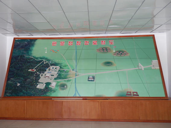 非武装地帯の入口では、お土産屋さんの横のスペースで板門店の見取り図をもとに、軍人に休戦協定の流れや、休戦協定後の南北朝鮮のやりとりなどの解説を受けます。